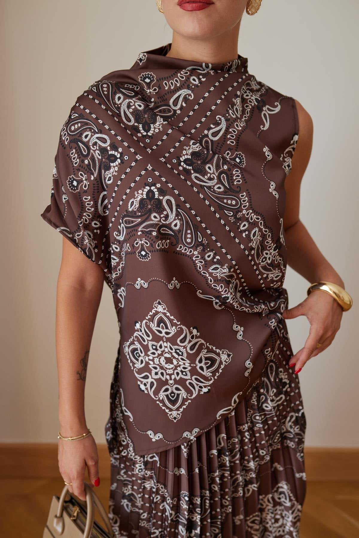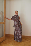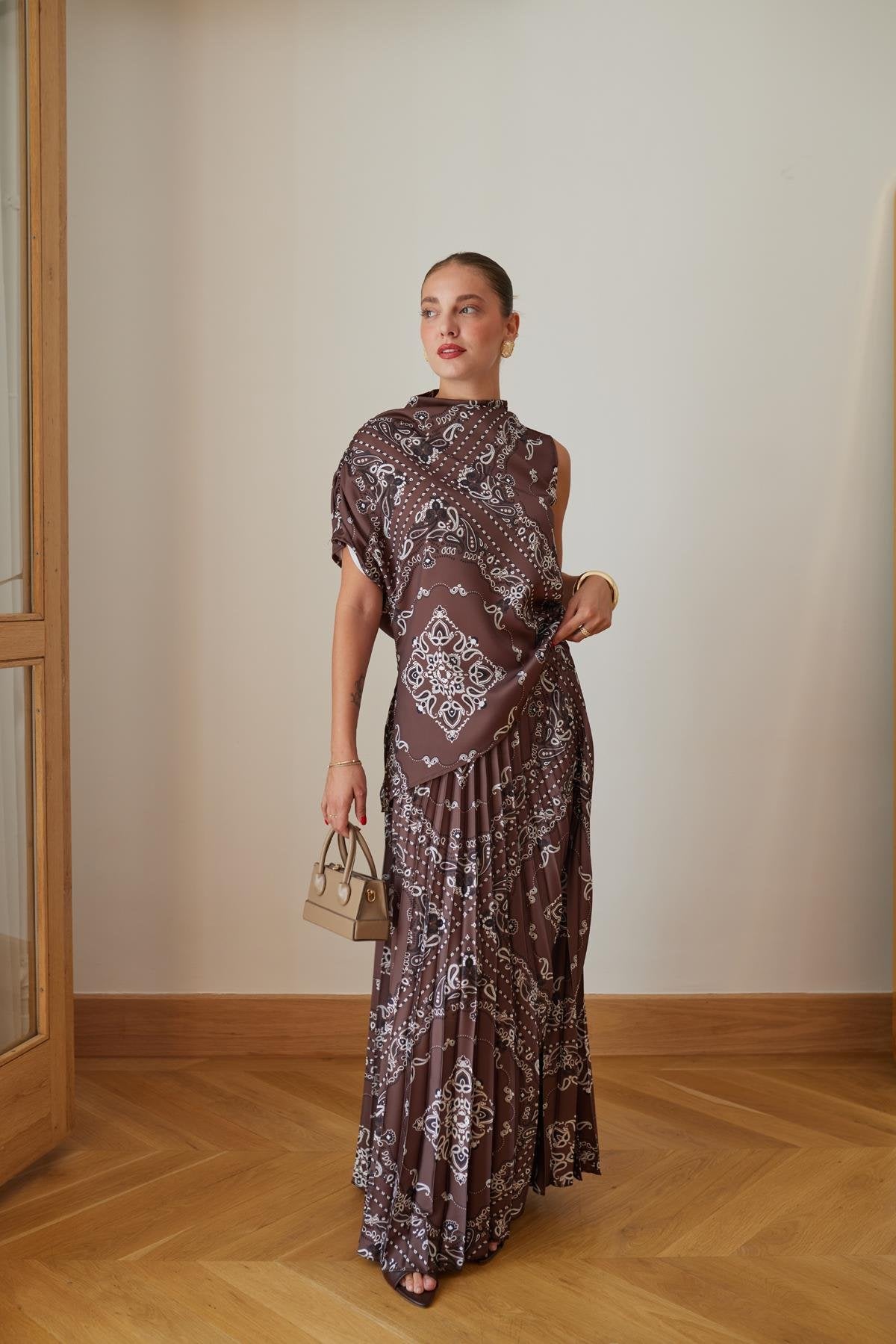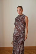 Abito lungo con gonna asimmetrica e fantasia